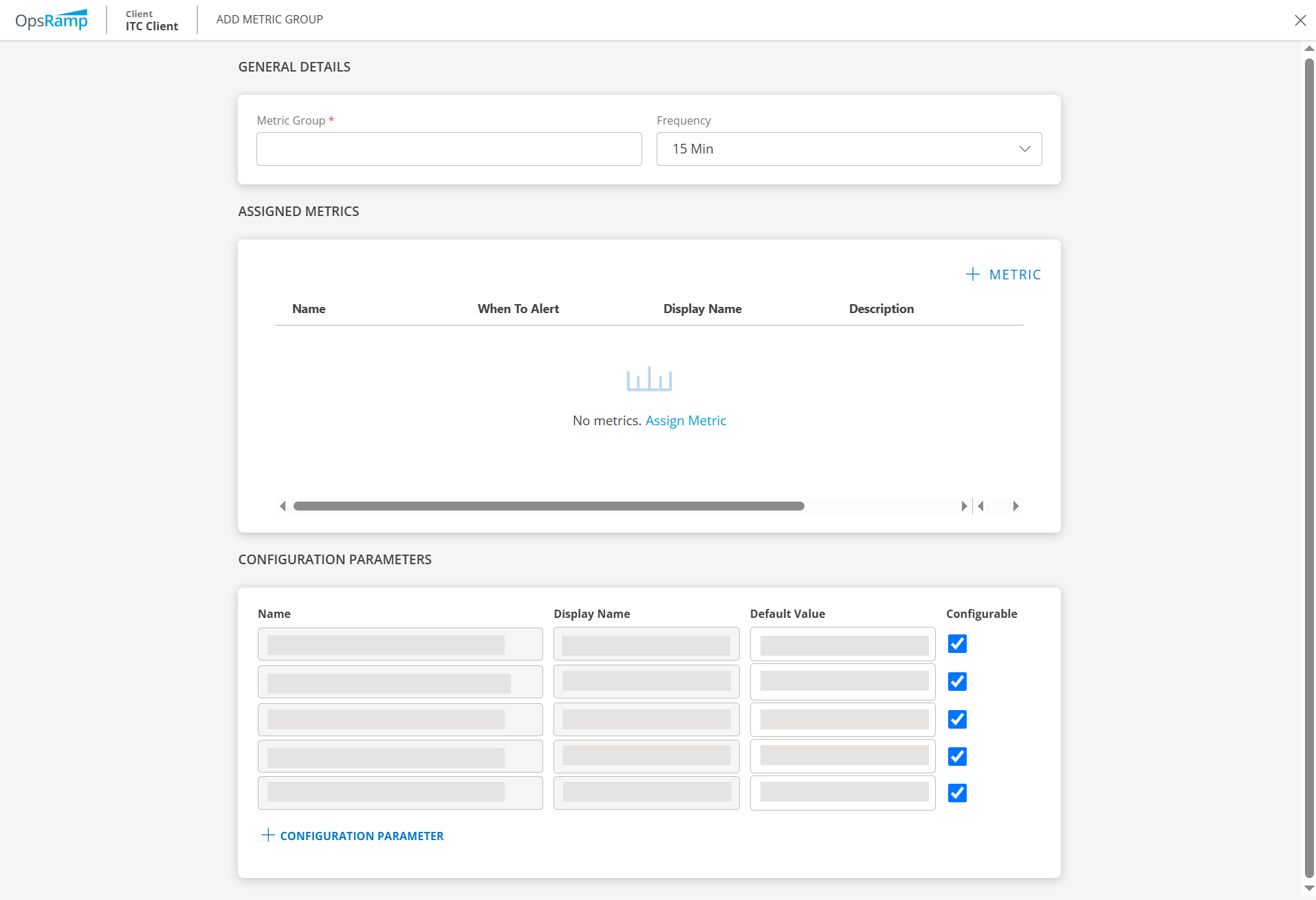 | Configuration Parameters | Click +Configuration Parameter to add parameters to the metric group. |