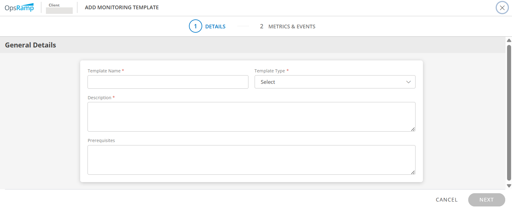Important: Most of the monitoring templates are available as part of the OpsRamp global templates under Recommended Templates page. If you wish to create your own monitoring template, the following section explains how to do that. We highly recommend that you firts check the recommended templates and utilize them by closing it for your purpose.